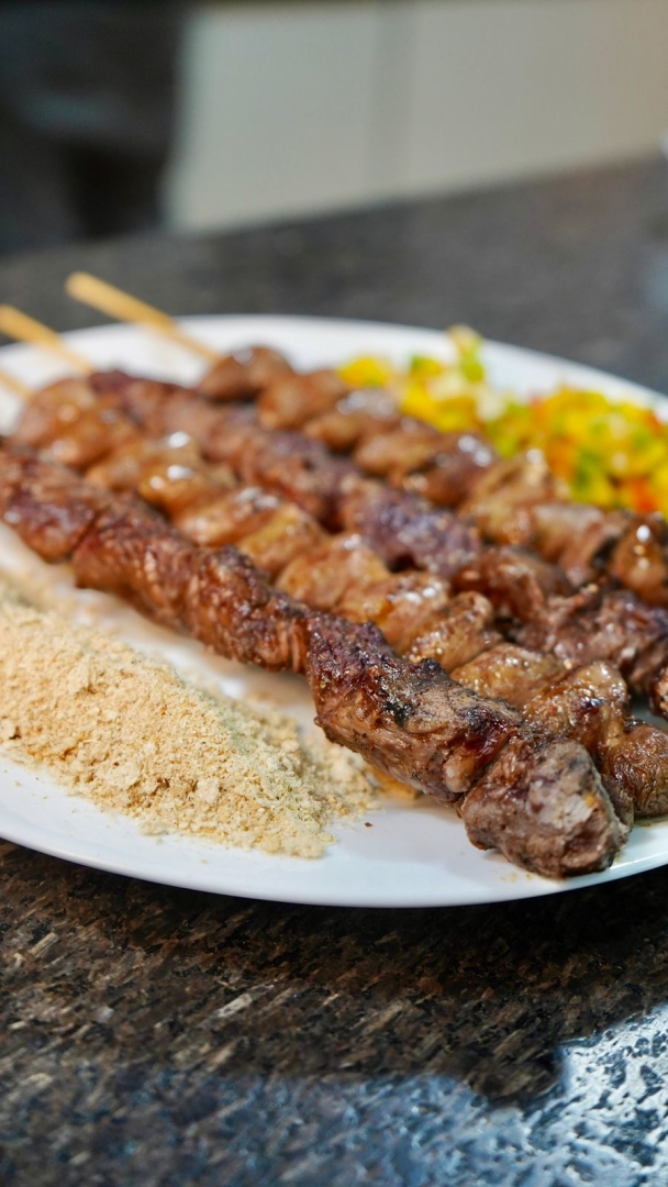 - 2 Espetinhos de Alcatra - 2 Espetinhos de Coração Este prato acompanha farofa e vinagrete para te proporcionar a verdadeira experiência do churrasco. Peça o seu combo e não passe vontade!