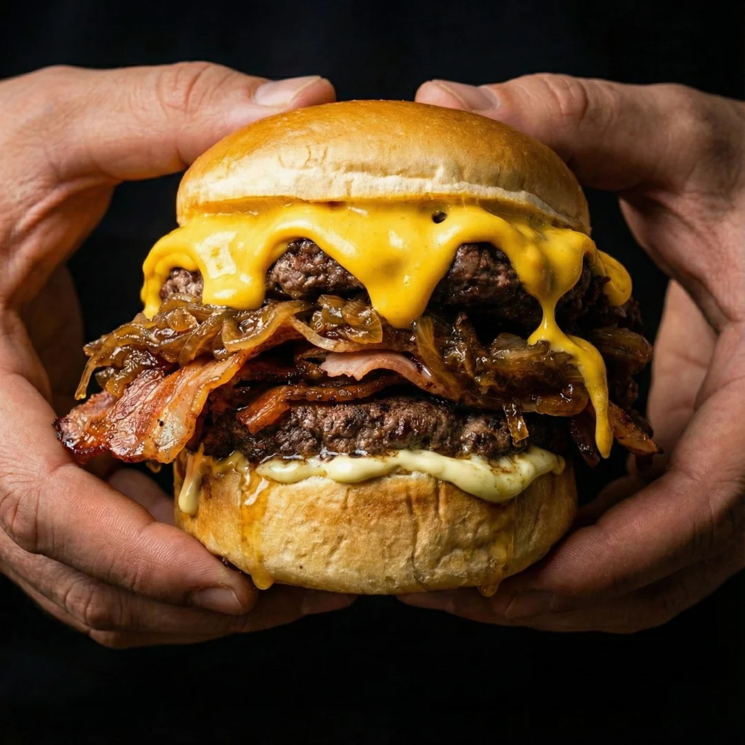 Supremo e gigante, feito com: - Pão brioche - 2 Hambúrgueres de 140g (In Natura) - Bacon - Cebola caramelizada - Cheddar Cremoso Bom né? Agora, ótimo mesmo será quando ele chegar aí na sua mesa. Peça já o seu!
